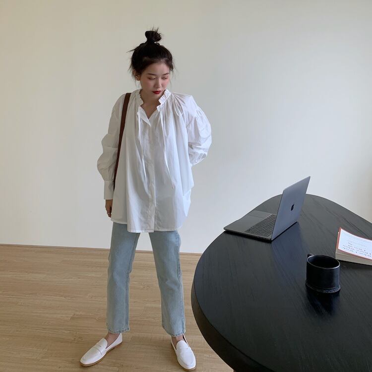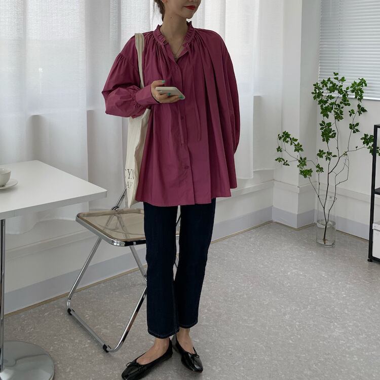 ふんわり可愛らしいこのシャツ、軽快な着心地が自慢の一枚です。ゆったりとしたシルエットで、身体を優しく包み込んでくれるため、リラックスしたい時や忙しい日にも最適です。